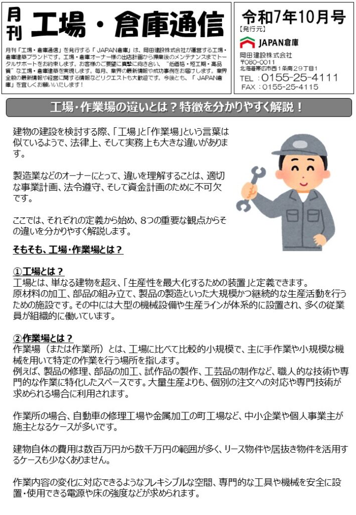 10月号の月刊工場・倉庫通信は、「工場・作業場の違いとは?特徴を分かりやすく解説!」です。ぜひご覧ください!