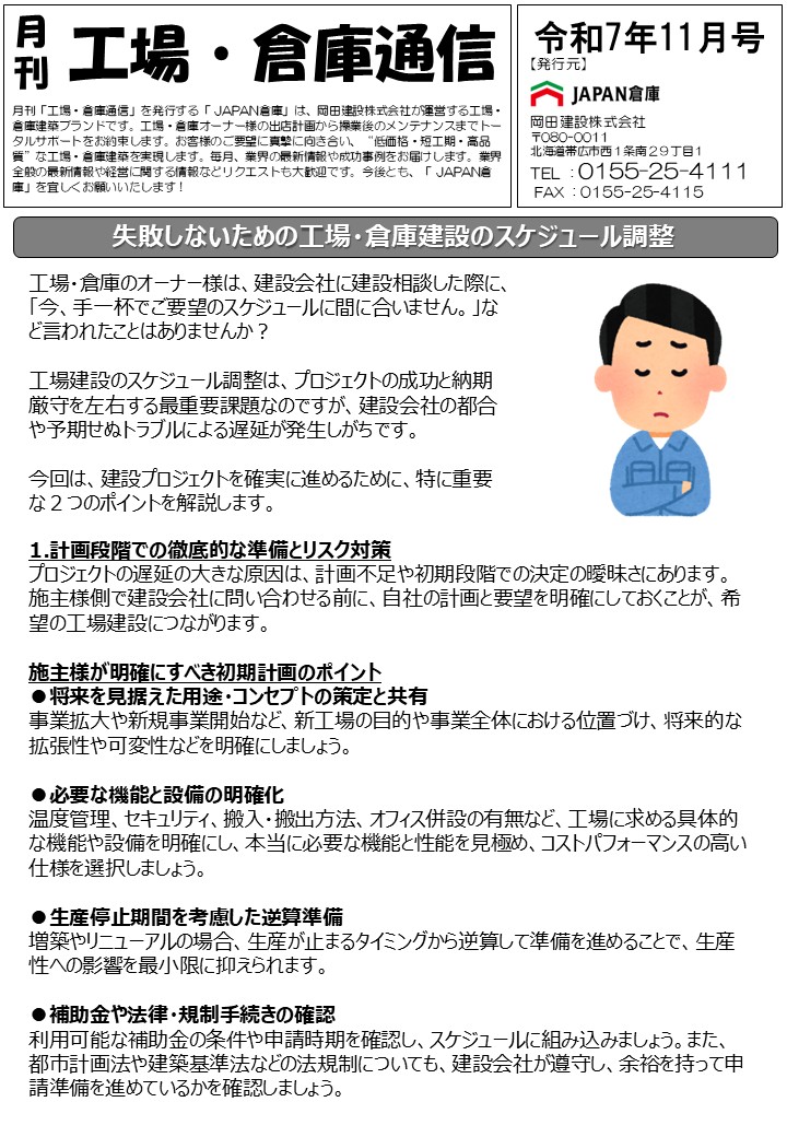 倉庫・工場通信(11月号)失敗しないための工場・倉庫建設のスケジュール調整 (修正)_スライド1 | JAPAN倉庫