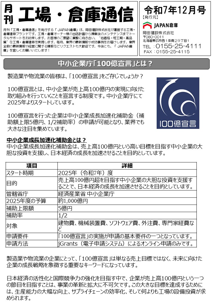 倉庫・工場通信(12月号)中小企業庁「100億宣言」とは?_スライド1 | JAPAN倉庫