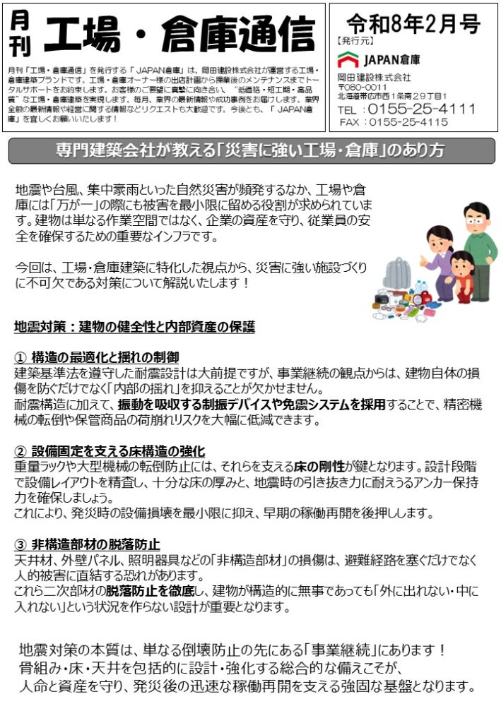 2月号の月刊工場・倉庫通信は、専門建築会社が教える「災害に強い工場・倉庫」のあり方 についてです。ぜひご覧ください!